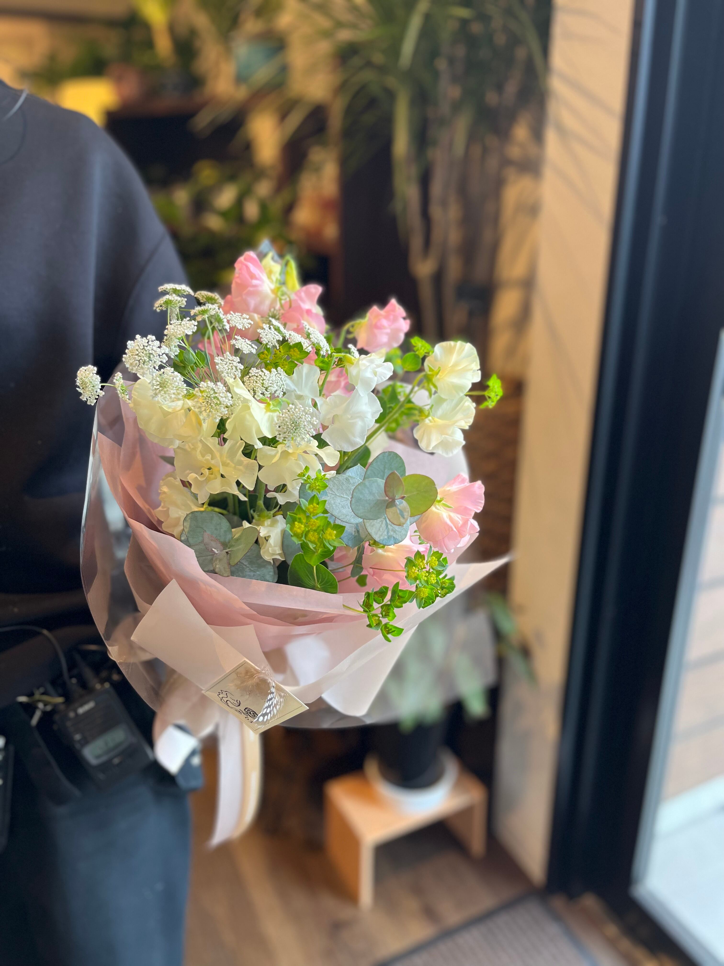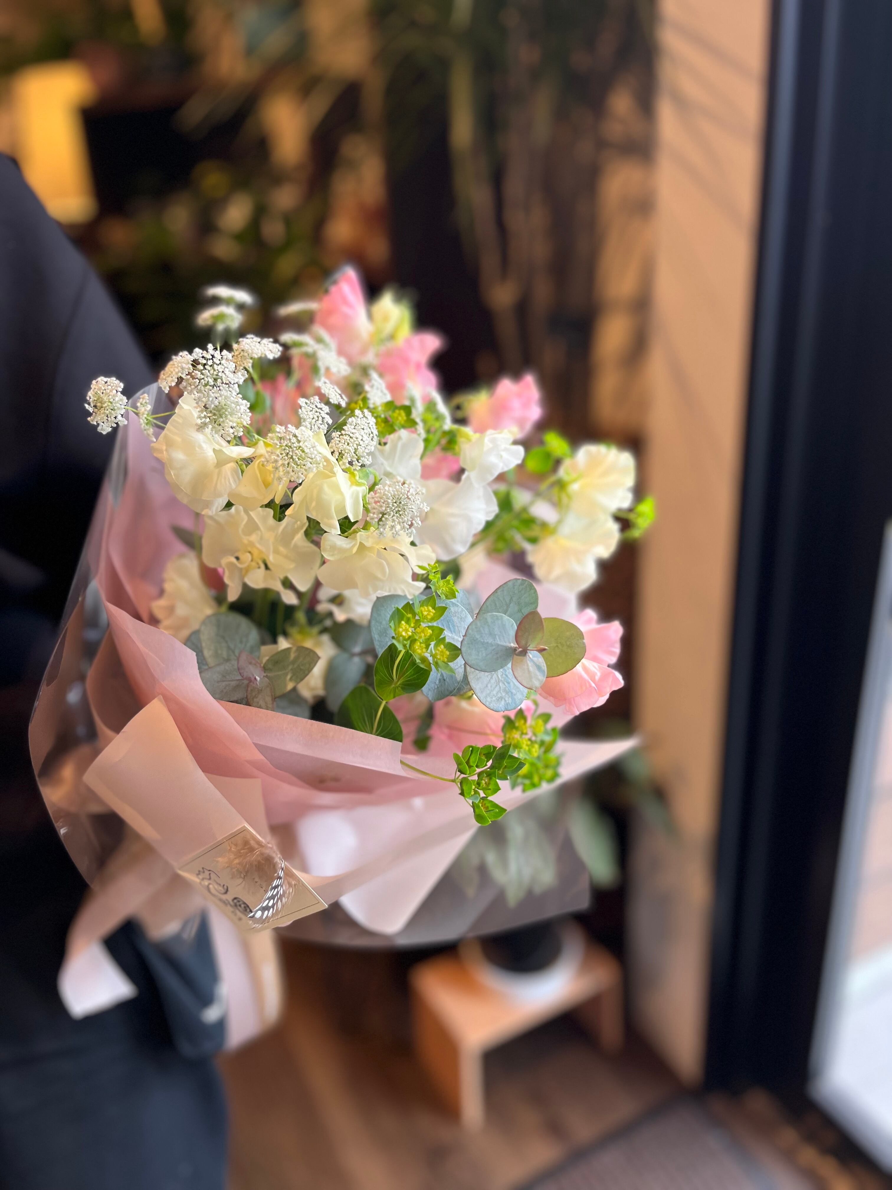 透明感のあるほんのり甘い香りのスイートピーを束ねたブーケです。