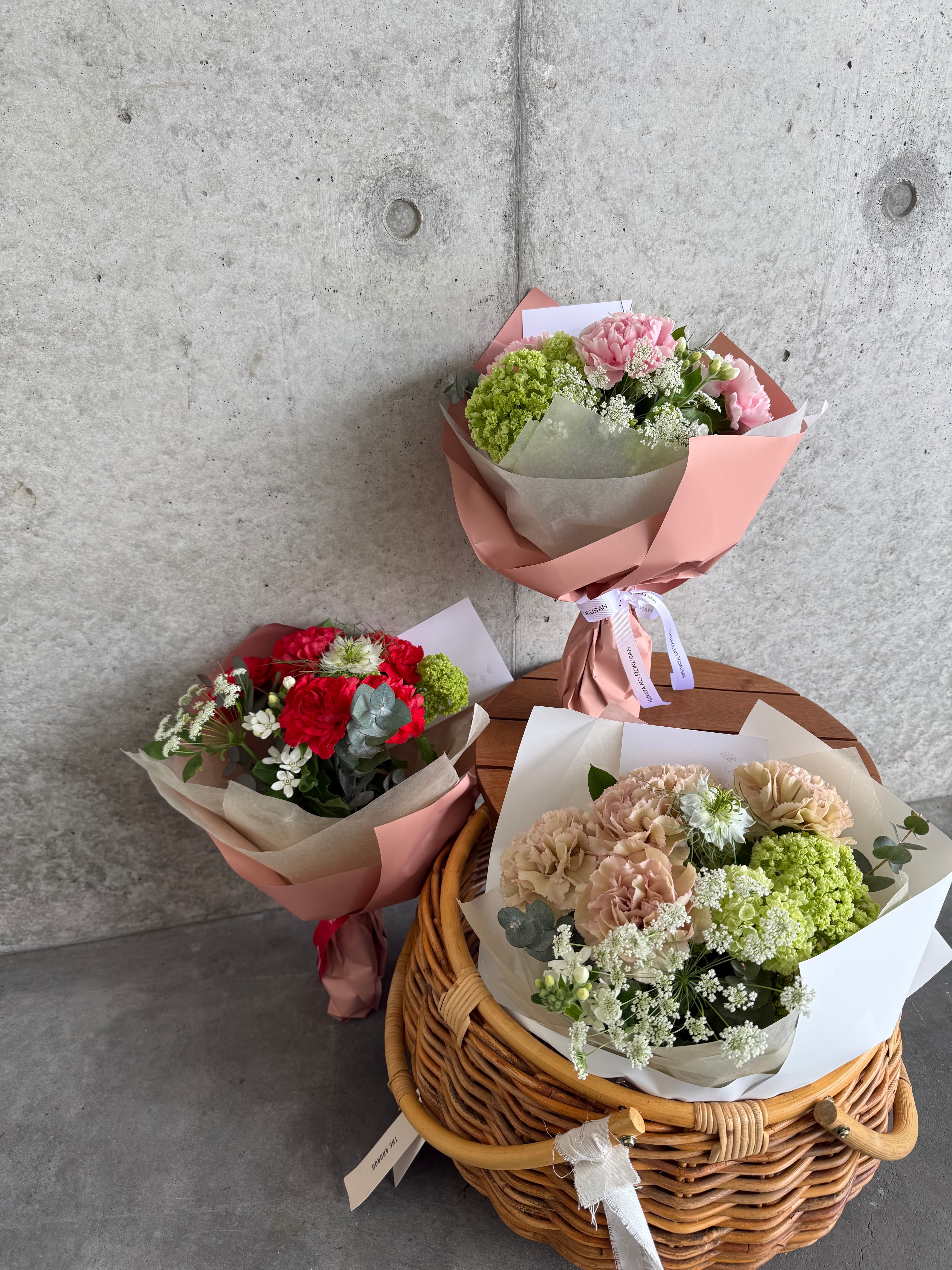 やさしく柔らかな印象のベージュのカーネーションを中心にご用意。