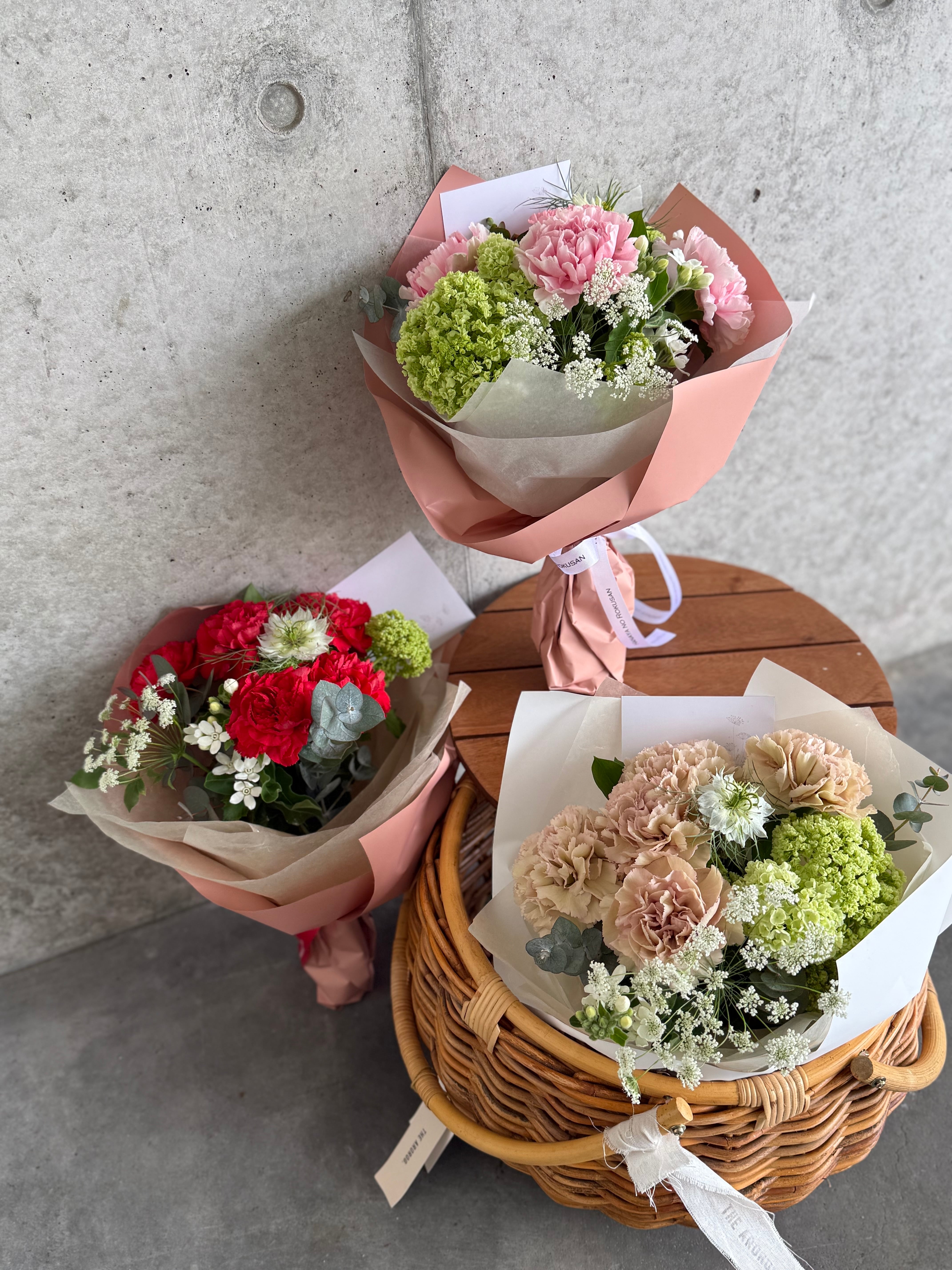 上品で華やかなピンクのカーネーションを中心に
